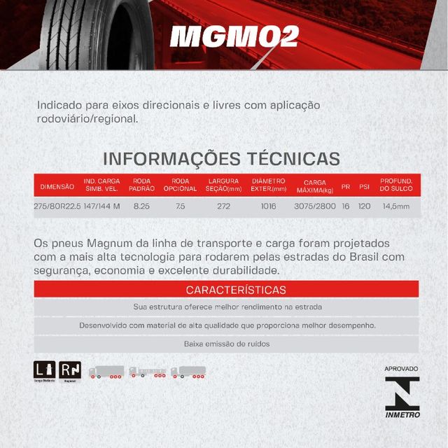 PNEU MAGNUM 275/80R22.5 MGM26(MISTO TRAÇÃO) PR16 146/143M TL
